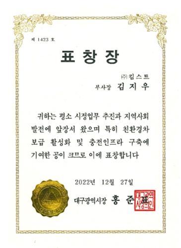 2022.12. 대구시장(홍준표) 표창(친환경차량 및 충전인프라 구축)